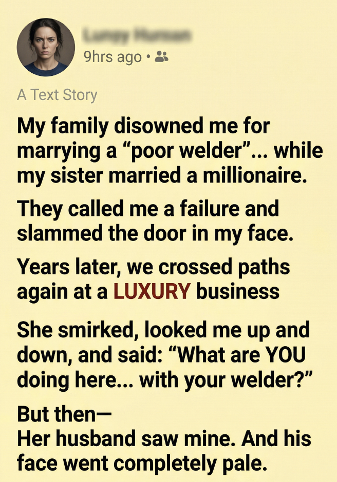 My family disowned me the day I married Daniel. Not because he was cruel or irresponsible, but because he was “just a welder.” To them, that word carried more weight than his character, more judgment than his kindness could ever erase. My parents had always cared about status, reputation, and how things looked from the outside. My sister Chloe fit perfectly into that world. She married a wealthy businessman, lived in a luxury condo, posted perfect photos, and made my parents proud in every way that mattered to them. When I introduced Daniel, they didn’t see a hardworking man with integrity. They saw grease on his hands, modest clothes, and a future they didn’t approve of. My mother called it a mistake. My father called it a waste. Chloe called it embarrassing. And when I chose Daniel anyway, they chose to cut me off. No more family dinners. No more holidays. No more calls. It was as if I had disappeared overnight.