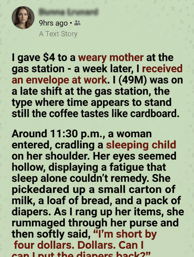 I didn’t even realize I had stopped breathing until I looked down at what else was inside the envelope. There wasn’t just four dollars. There was more—far more than that small amount I had given. Not enough to change my life, but enough to show that she had gone out of her way to give back, even when she clearly didn’t have much herself.
