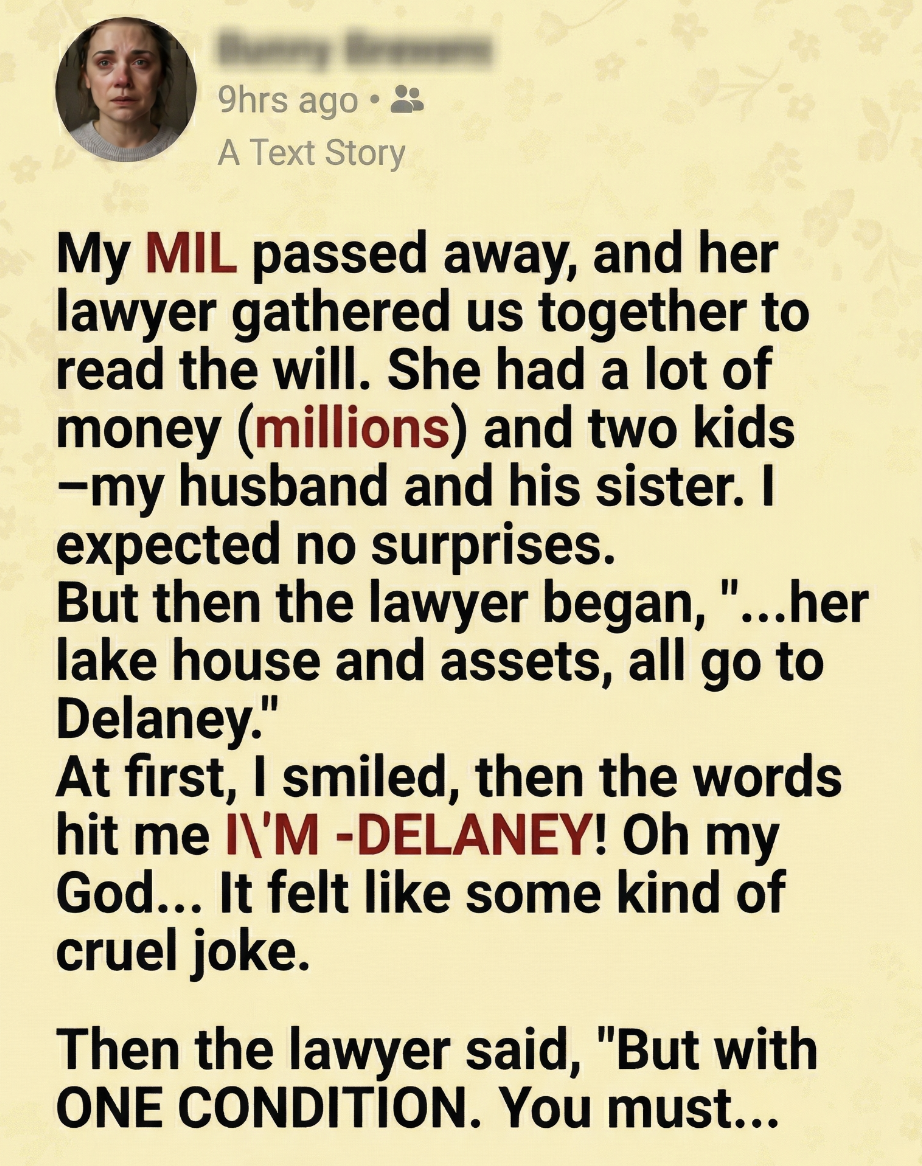 My mother-in-law passed away suddenly, and a few days later, her lawyer called us all in to read the will. She had built a fortune over the years—millions in assets, properties, investments, and a beautiful lake house that had been in the family for decades. Everyone assumed it would go to her two children—my husband and his sister.