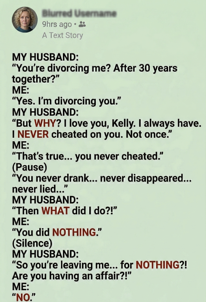 My husband stared at me like I had just destroyed his entire world. “After 30 years… you’re divorcing me?” “Yes,” I said quietly. “I am.” He shook his head, pacing like he couldn’t process it. “But WHY? I love you, Kelly. I always have. I NEVER cheated on you. Not once.” I nodded. “That’s true.” He stopped. “You never cheated… you never drank… you never stayed out late… you never lied…” For a moment, hope flickered across his face. “Then what did I do wrong?” he asked. I looked at him. “You did nothing.” Silence filled the room. He blinked. “…Nothing?” “Yes.” His voice cracked. “So you’re leaving me… for nothing? Are you having an affair?!” “NO,” I said firmly. Then softer, “I’m leaving… because of everything you never did.” He just stood there, frozen, and for the first time in 30 years, I finally said it out loud.