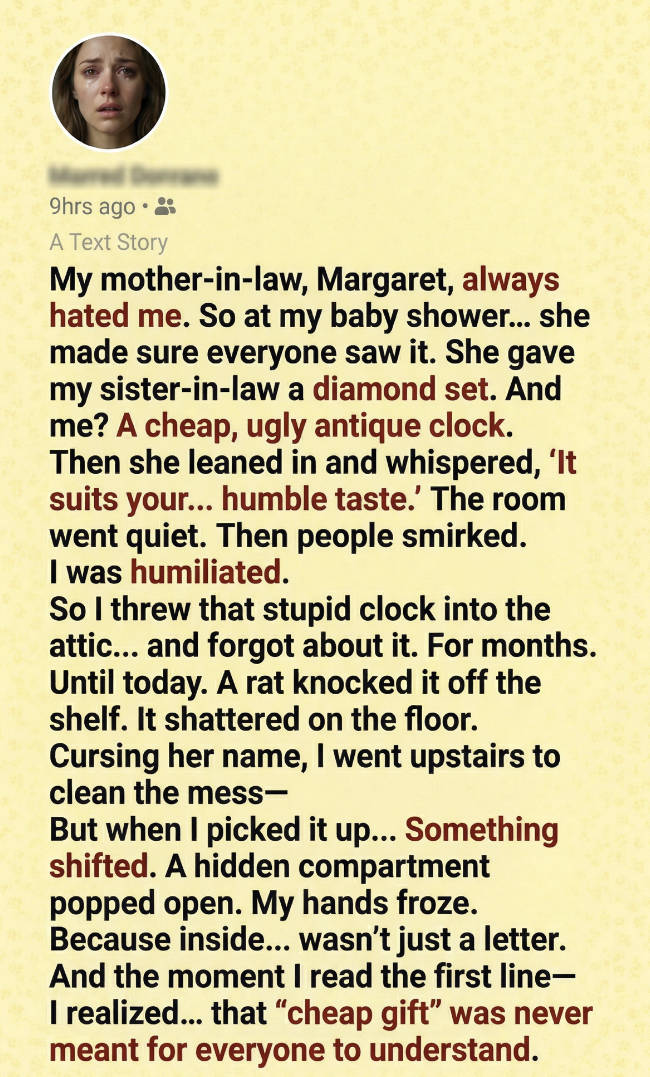 In front of everyone, she handed my sister-in-law a beautiful diamond set. The room filled with admiration. Smiles. Compliments. Then she turned to me and gave me a small, wrapped box. When I opened it, it was an old, cheap-looking antique clock. Scratched wood, faded face, nothing special at all. Then she leaned closer and whispered just loud enough for a few people to hear, “It suits your… humble taste.” A few people smirked. No one defended me. I smiled through it, but inside, I felt small.