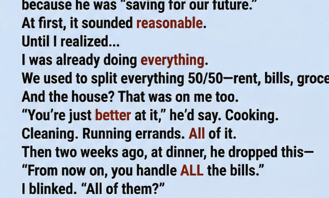 My husband told me to pay all our bills because he was “saving up for our future.” At first, it sounded almost responsible. We had always split everything 50/50—rent, groceries, utilities. I handled most of the housework because, as he liked to say, “You’re just better at it.” It wasn’t perfect, but it worked.