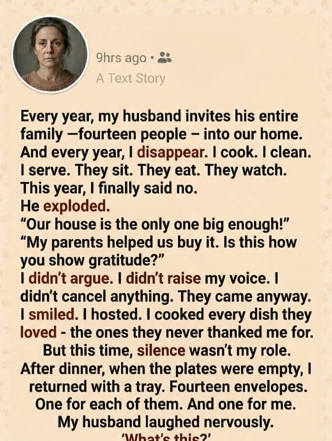Every year, my husband invited his entire family—fourteen people—into our home. And every year, I disappeared. Not physically, but in every way that mattered. I became the one in the background. The one moving nonstop while everyone else relaxed. I cooked for hours, cleaned before and after, refilled glasses, cleared plates, smiled on cue. They sat, they ate, they laughed, they watched. No one asked if I was tired. No one offered to help. And my husband? He acted like it was all normal. Like this was simply my role.