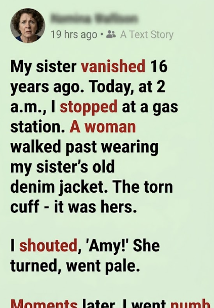 My sister vanished 16 years ago. Today, at 2 a.m., I stopped at a gas station. A woman walked past wearing my sister’s old denim jacket. The torn cuff—it was hers. Hers.