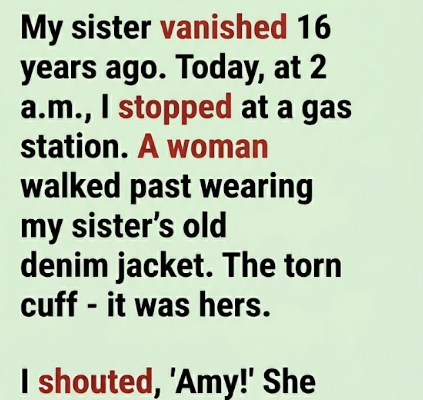 My sister vanished 16 years ago. Today, at 2 a.m., I stopped at a gas station. A woman walked past wearing my sister’s old denim jacket. The torn cuff—it was hers. Hers.