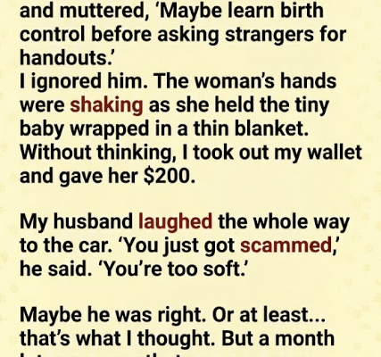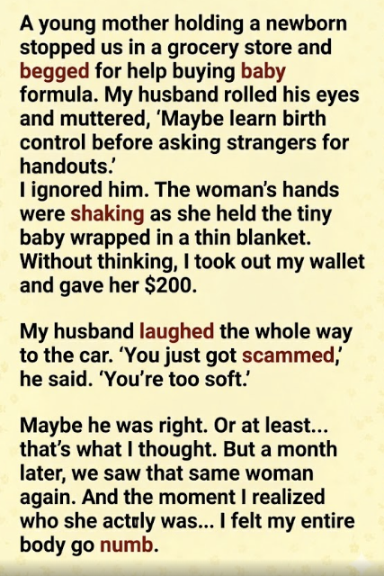 A young mother holding a newborn stopped us in a grocery store and begged for help buying baby formula. My husband rolled his eyes and muttered, “Maybe learn birth control before asking strangers for handouts.” I ignored him. The woman’s hands were shaking as she held the tiny baby wrapped in a thin blanket. Without thinking, I took out my wallet and gave her $200. My husband laughed the whole way to the car. “You just got scammed,” he said. “You’re too soft.” Maybe he was right. Or at least… that’s what I thought. But a month later, we saw that same woman again. And at the moment I realized who she actually was… I felt my entire body go numb.