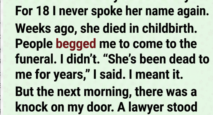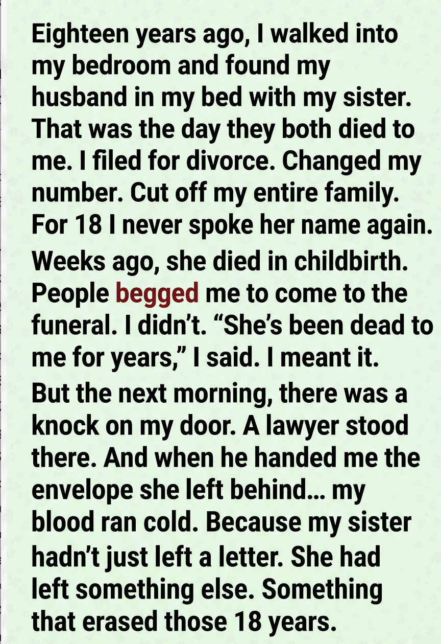 Eighteen years ago, I walked into my bedroom and found my husband in my bed with my sister. That was the day they both died to me. I filed for divorce. Changed my number. Cut off my entire family. For 18 years, I never spoke her name again. Weeks ago, she died in childbirth. People begged me to come to the funeral. I didn’t. “She’s been dead to me for years,” I said. I meant it. But the next morning, there was a knock on my door. A lawyer stood there. And when he handed me the envelope she left behind… my blood ran cold. Because my sister hadn’t just left a letter. She had left something else. Something that erased those 18 years.