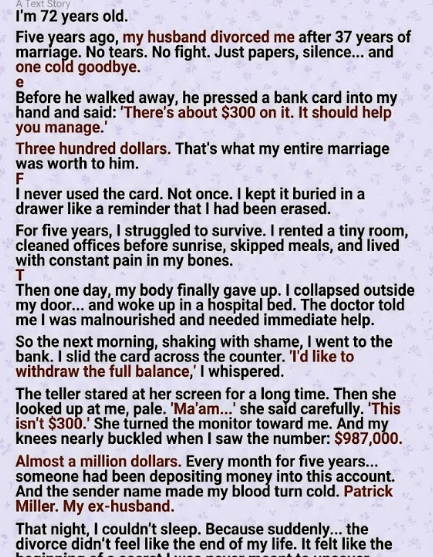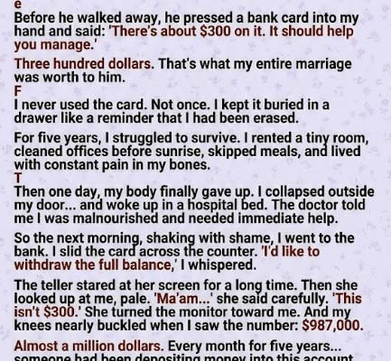 “He opened that account in your name,” she continued. “Set up automatic deposits. Told me never to tell you unless…”