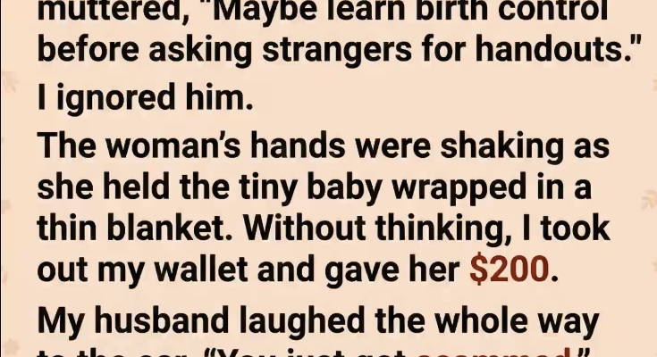 Her eyes filled instantly. She kept saying thank you over and over like she couldn’t believe it was real. We walked away, and my husband laughed the entire way to the car, telling me I had just been scammed, that I was too soft, that people like her knew exactly how to manipulate emotions. I didn’t argue, but his words stayed with me longer than I wanted them to.
