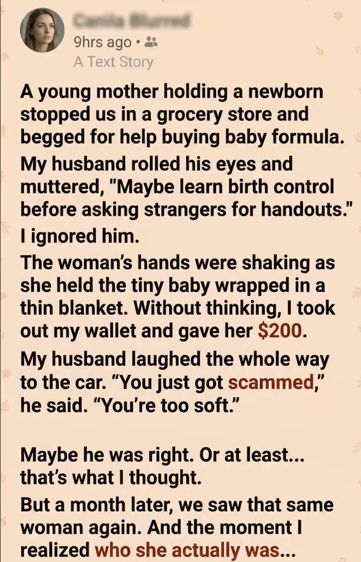 We were walking out of the grocery store when she stopped us. A young mother, barely holding herself together, clutching a newborn wrapped in a thin blanket. Her voice shook as she asked if we could help her buy baby formula. My husband rolled his eyes and muttered something cruel under his breath about people like her asking strangers for handouts. I ignored him because I couldn’t stop staring at her hands. They were trembling so badly it didn’t look like an act. It looked like fear.