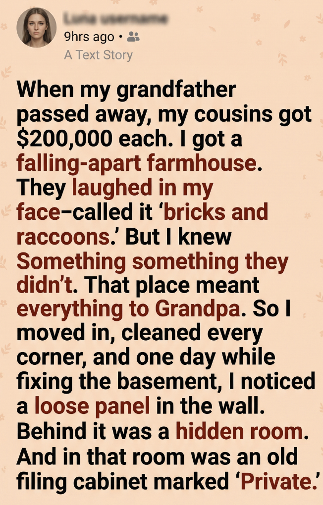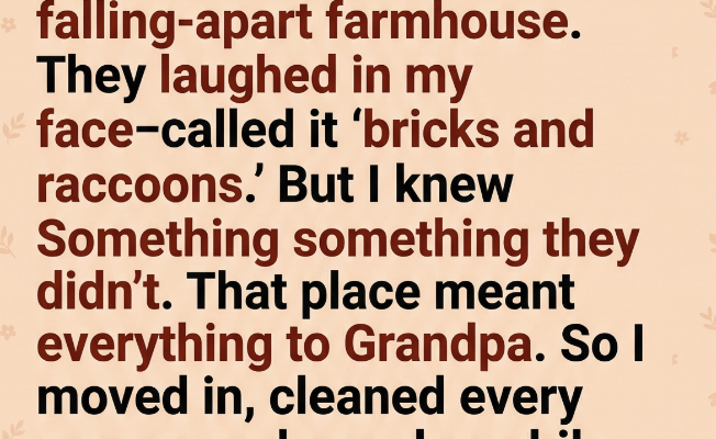 When my grandfather passed away, the will shocked everyone. My cousins each got $200,000 in cash. I got the farmhouse. Not just any farmhouse—the old, sagging, paint-chipped place at the edge of town. The one with creaky floors, broken shutters, and raccoons living in the attic. They didn’t even try to hide their laughter. “Enjoy your bricks and raccoons,” one of them said. I smiled, but inside, I felt something different. Because I knew something they didn’t. That house wasn’t just property. It was his place.